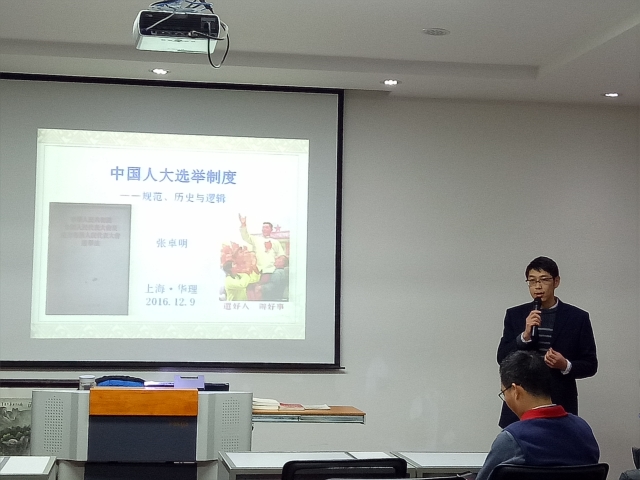宪法日的脚步尚未远离,世界人权日即将到来,12月9日正是世界反腐败日,在这个特殊的日子,华东政法大学法律学院副教授、硕士生导师张卓明博士为我校学生做了“中国人大选举制度——规范、历史与逻辑”的专题讲座。张卓明通过对我国选举法规范及其历史演进的分析,并结合辽宁贿选案等现实案例,为同学们揭示了人大选举制度背后的逻辑。