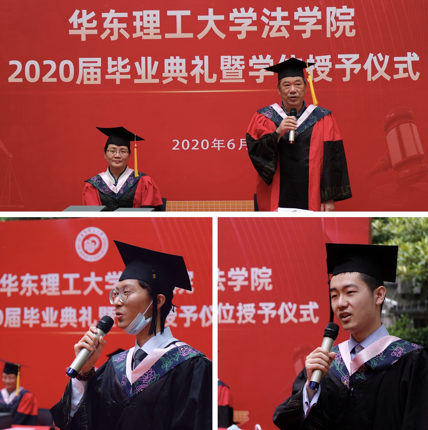随后,法学161班孙佳木和法学162班张璞分别作为毕业生代表发言。他们表示会始终践行“勤奋求实,励志明德”的华理精神,始终牢记师长教诲和母校嘱托,坚定理想信念,练就过硬本领,以守护公平正义为己任,用实际行动践行“法治天下”的崇高信念。