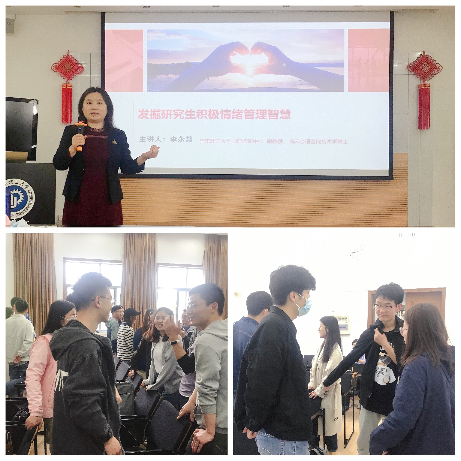 4月23日,kaiyun开云官方在徐汇校区图书馆201举办“发掘研究生积极情绪管理智慧”心理调适主题讲座。本次讲座由我校心理咨询中心副主任、华东师范大学临床心理咨询技术学博士李永慧副教授主讲。近百名研究生踊跃参与。