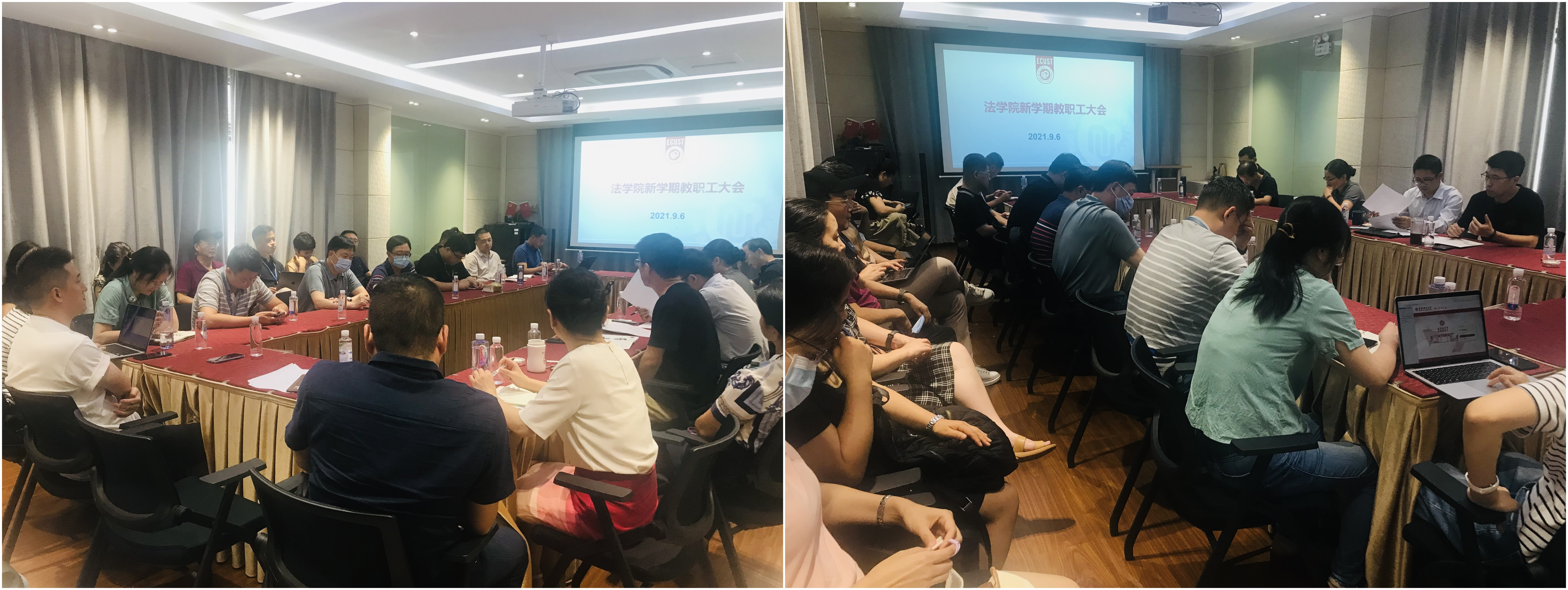 会上,副院长周登谅通报了本科生报到情况,特别提醒教师要关爱因疫情等原因没能参加线下学习的学生,及时建立线上课程应急预案。他分析了目前本科教学中存在的问题,就教学大纲、课堂教学、试卷批改等各项教学事宜进行了安排部署,并鼓励教师多方位、多角度指导学生参加大创项目、学科竞赛等活动。副院长孙晓东通报了法学硕士点民商法方向建设背景和建设进度,并就研究生教学课程资料、新生导师见面会等新学期工作进行了安排部署,强调务必确保研究生新生教学等各项工作平稳有序地开展。党委副书记周建国就学生专业引导、学生就业、学生安全三方面进行了现状分析,安排了新学期师生交流、职业规划引导等方面工作,并希望班导师、硕士生导师、任课教师多角度加强学生思想和心理安全的关注。