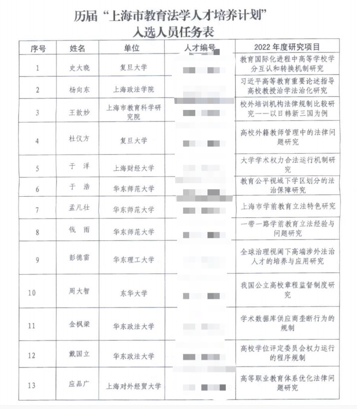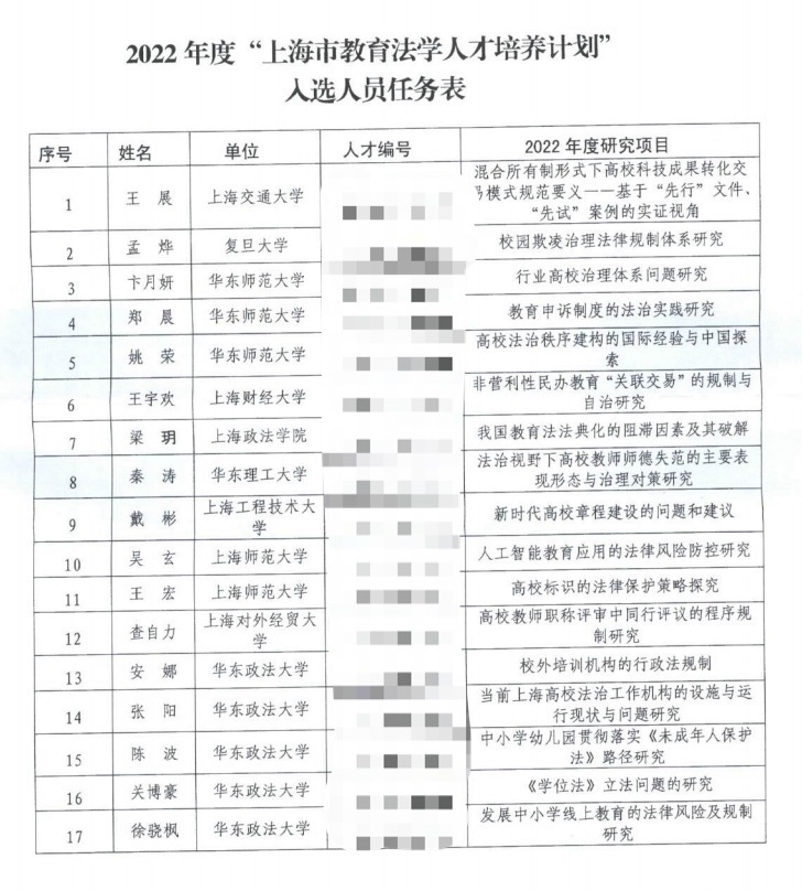 9月14日,上海市教委公布了2022年度“上海市教育法学人才培养计划”项目评审结果,全市共有17人入选。kaiyun开云官方秦涛副教授入选该计划,其2022年度研究项目为“法治视野下高校教师师德失范的主要表现形态与治理对策研究”。此外,kaiyun开云官方彭德雷副教授已于2020年入选该计划,其2022年度研究项目为“全球治理视阈下高端涉外法治人才的培养与应用研究”。