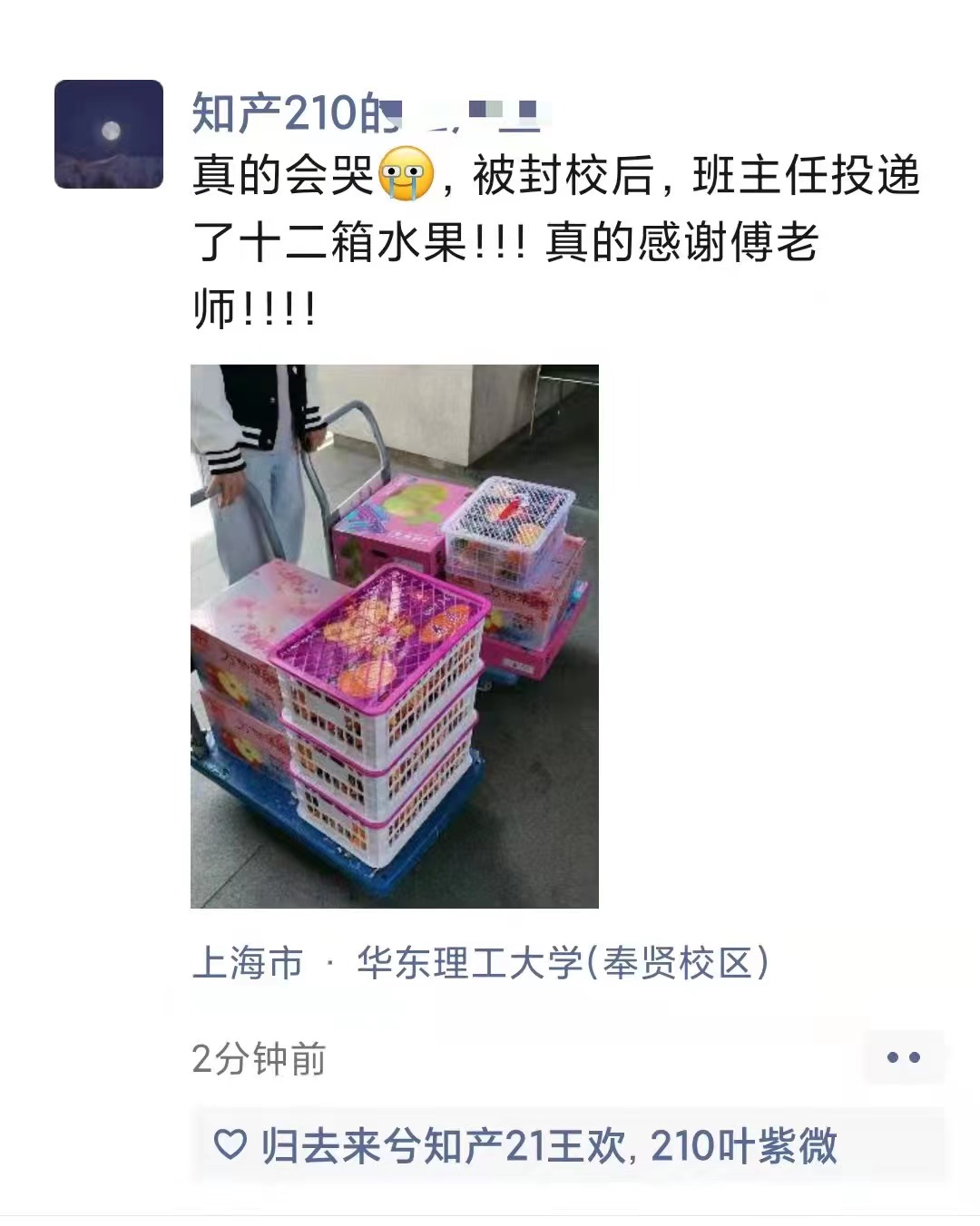 封闭管理期间,各项学生活动从线下转移到线上。3月15日下午,优秀学生成长经验分享会上,30余名学生参加了交流。学生的心理状态也是学院关注的重点。分管学生工作的党委副书记周建国组织辅导员、班导师、研究生导师,通过开班会、打电话等方式积极与学生沟通,了解他们的学习和生活情况,帮助解决遇到的困难。傅利英老师作为知识产权210班班导师,自掏腰包给学生快递去12箱水果。