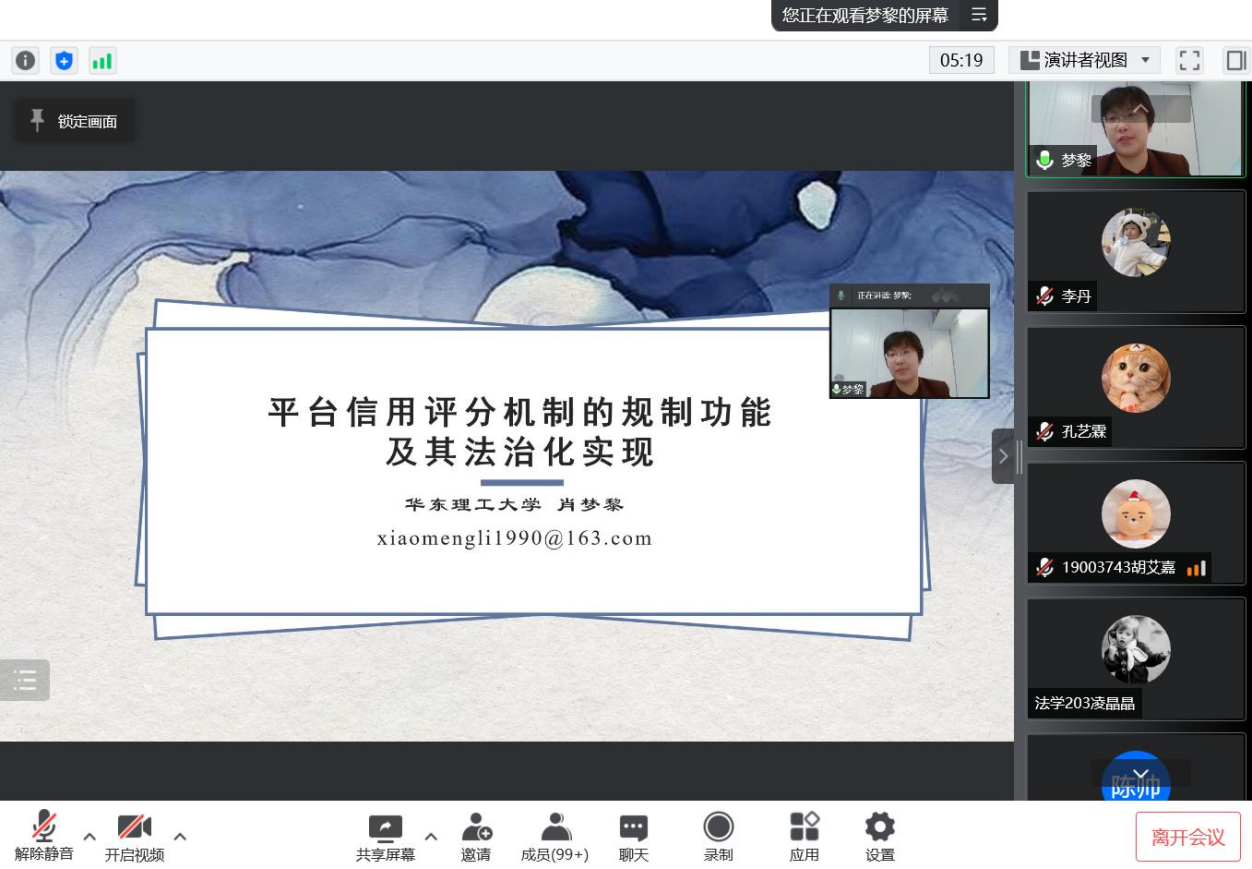 师生交流环节中,肖梦黎与师生围绕平台信用评分的退出机制、平台信用评分规则制定与实施主体同一性的冲突、个人信息保护与数据全面收集的悖论、信用评分结果的外溢效应限制、非传统法学领域的学术研究路径等展开了的充分讨论。