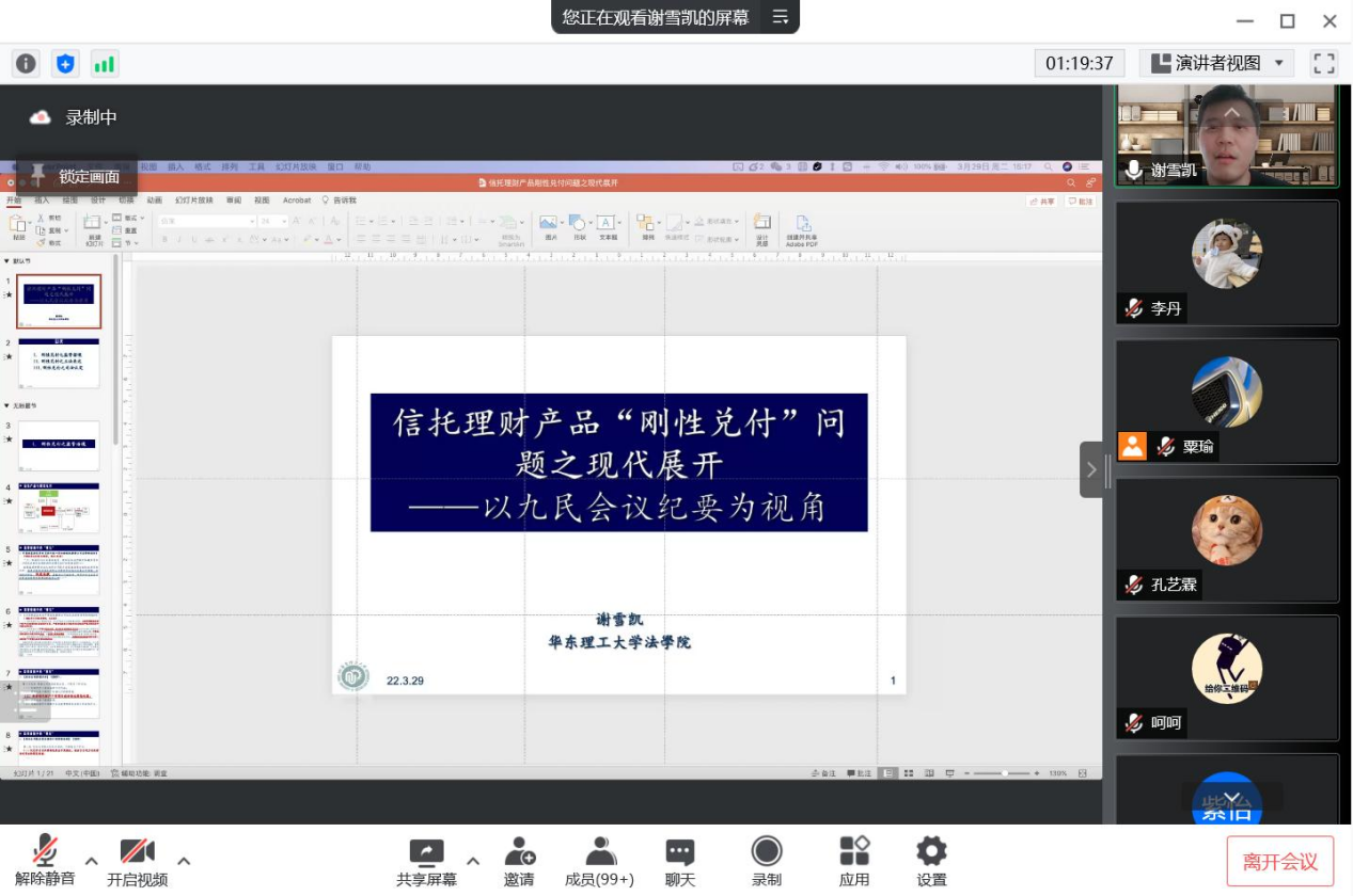谢雪凯以“信托理财产品‘刚性兑付’问题之现代展开:以九民会议纪要为视角”为题,从信托产品与刚性兑付的基本交易逻辑展开,介绍了监管机构对于刚性兑付的相关监管政策,重点分析了《九民会议纪要》对于刚性兑付的法律性质、法律效力的立法规定,以及司法实践中对于刚性兑付无效认定的处理方式。