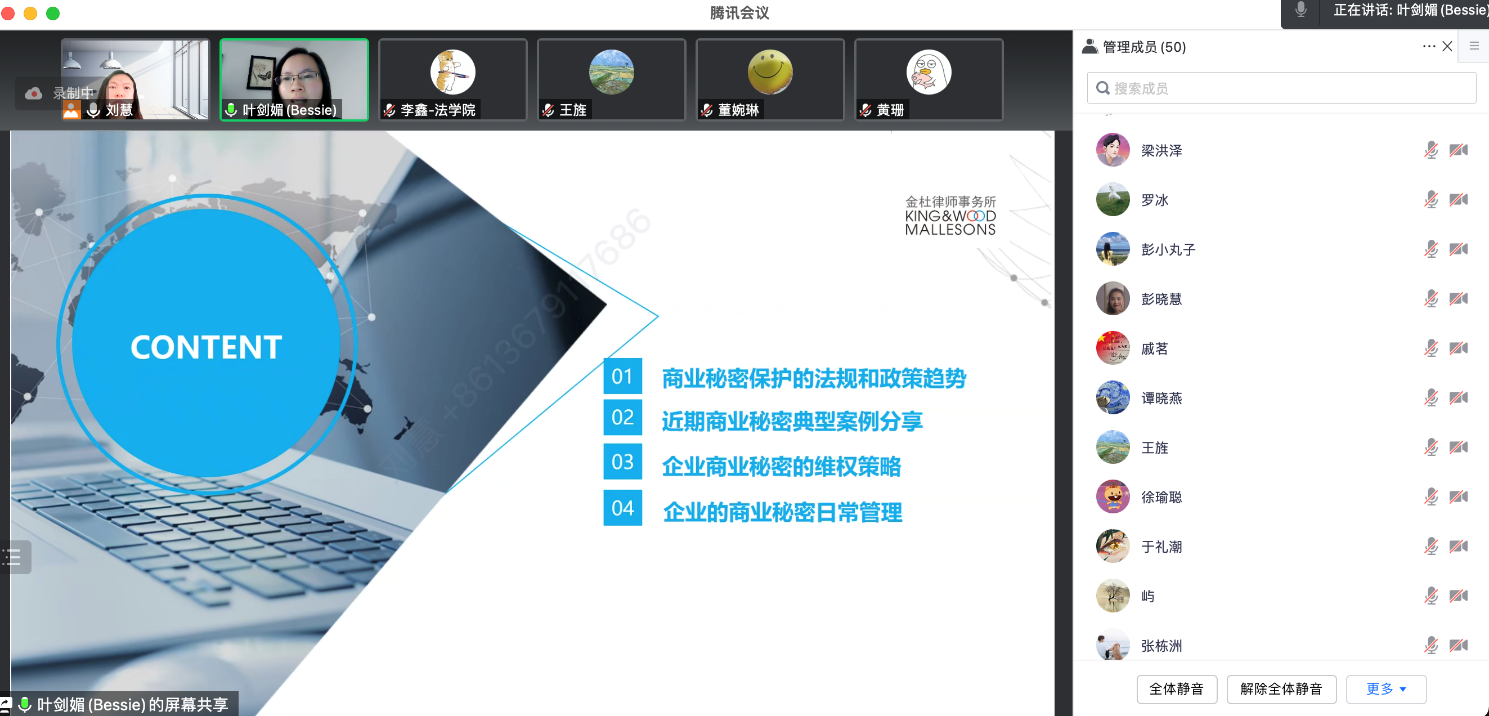 11月19日上午,华理知识产权讲坛系列讲座(五)—“商业秘密保护的最新发展趋势和热点问题”在线上顺利举行。本次讲座邀请了金杜律师事务所IP部合伙人、华理kaiyun开云官方校外导师叶剑媚律师主讲,由kaiyun开云官方知识产权研究中心刘慧老师主持,kaiyun开云官方知识产权研究中心主任张晓东和傅利英副教授参与会议。近70名校内外师生、业界人士聆听了本次讲座。讲座总时长2个半小时。
