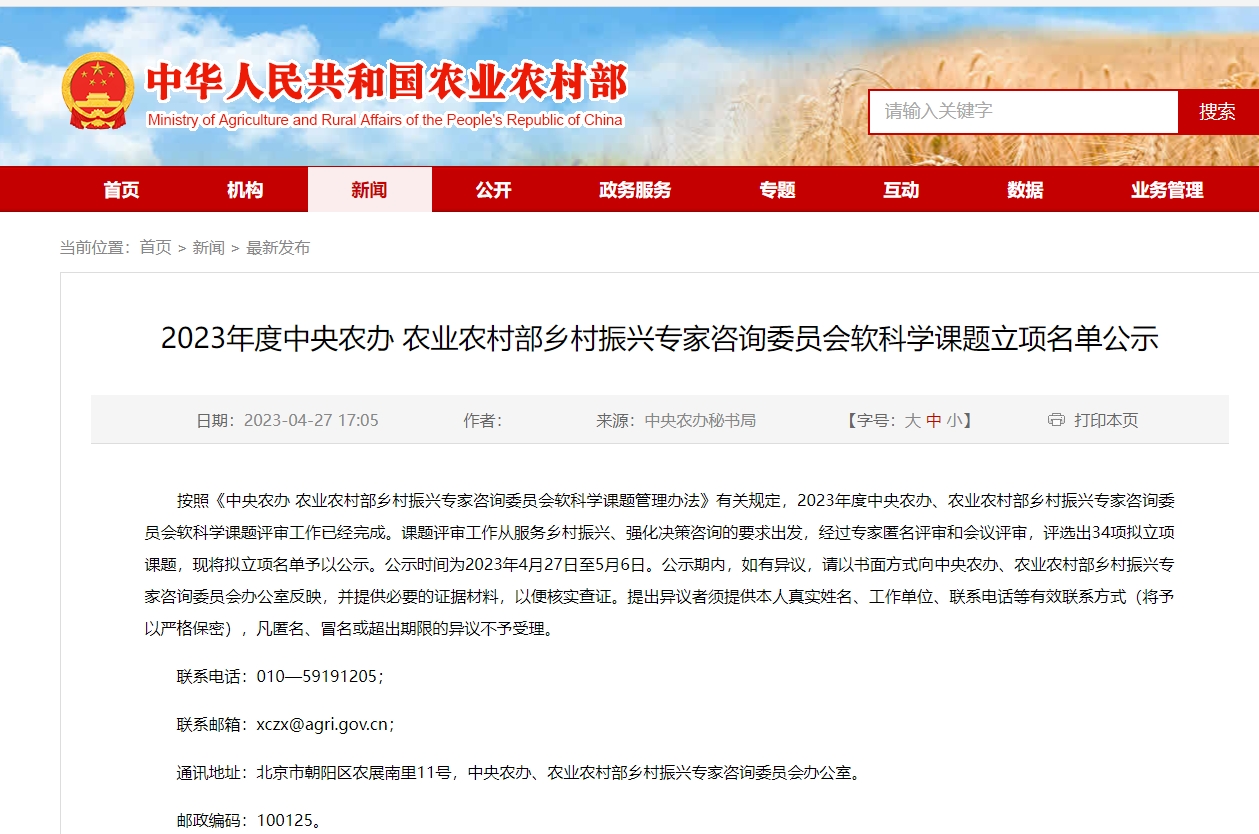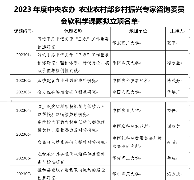 中央农办、农业农村部乡村振兴专家咨询委员会以习近平新时代中国特色社会主义思想为指导,全面贯彻党的二十大精神,深入学习贯彻习近平总书记关于“三农”工作的重要论述,根据2022年中央经济工作会议和中央农村工作会议部署,围绕全面推进乡村振兴、加快建设农业强国重点工作,设置2023年度软科学研究课题。
