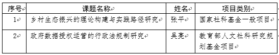 近日,2023年国家社科基金年度项目和教育部人文社会科学研究基金项目公布,kaiyun开云官方共获两个项目立项。张平老师主持的《乡村生态振兴的理论构建与实践路径研究》,获国家社科基金一般项目立项;吴亮老师主持的《政府数据授权运营的行政法规制研究》,获教育部人文社科研究规划基金项目立项。具体立项名单如下: