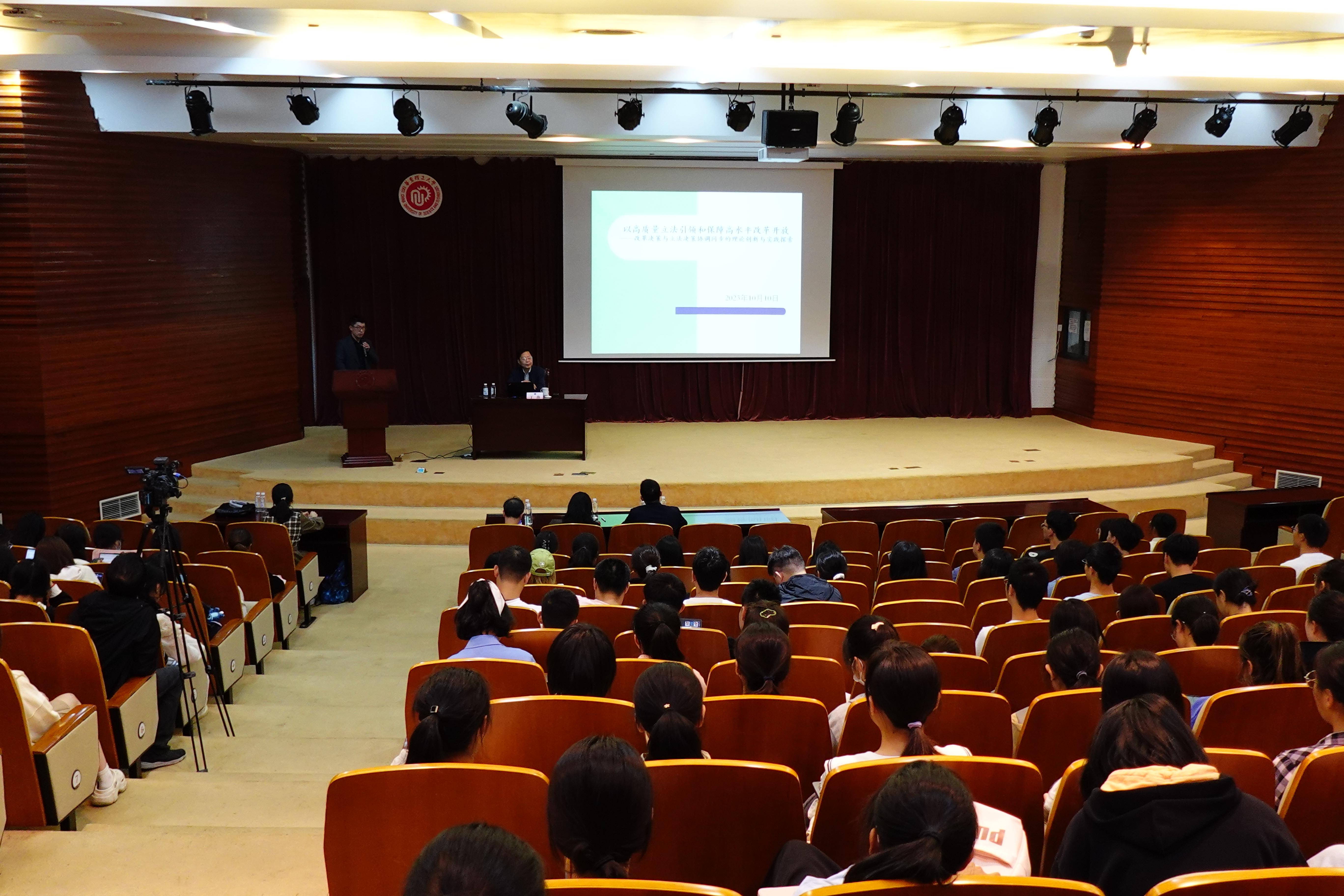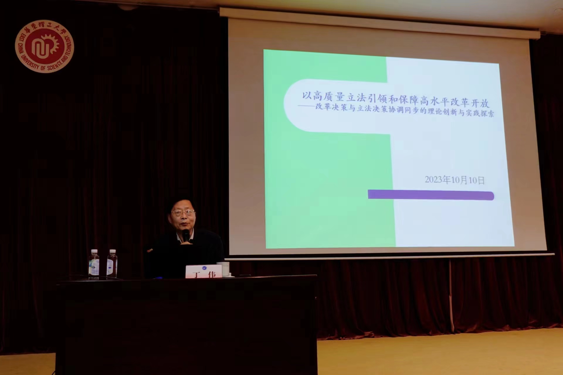 10月10日下午,第98期“通海讲堂”在奉贤校区敬贤堂举行,中共上海市委法律顾问、市人大常委会立法专家顾问、华东政法大学教授、博士生导师、中国国际私法学会副会长、上海市法学会副会长丁伟为华理师生解读“以高质量立法引领和保证高水平改革开放——改革决策与立法决策协调同步的理论创新与实践探索”。kaiyun开云官方院长彭德雷,副院长周登谅,党委副书记周建国,kaiyun开云官方国际民商事合作研究中心主任祝宁波与学生共同聆听讲座。本次讲座由周登谅主持。
