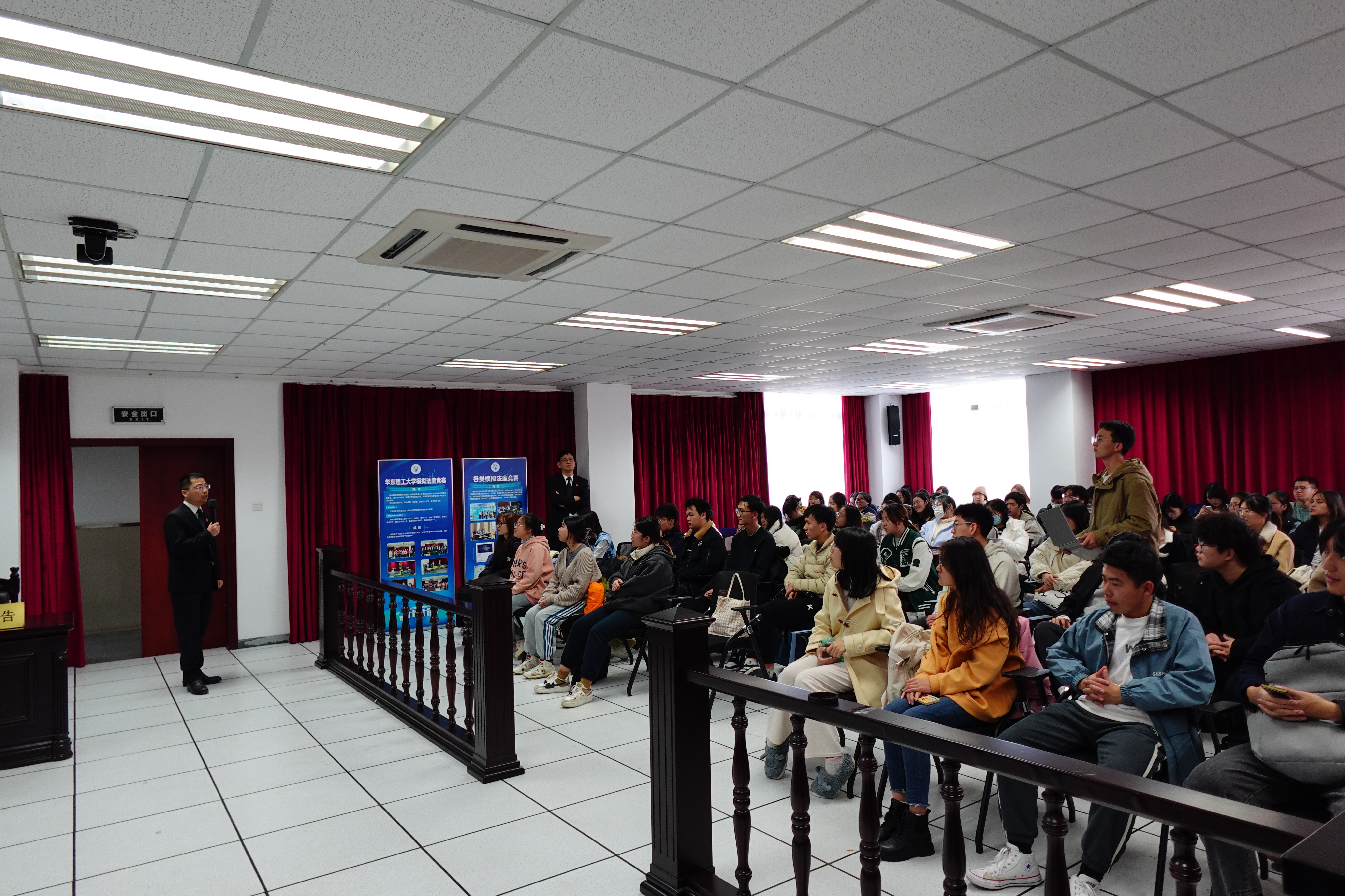 12月7日下午,奉贤区人民法院巡回法庭到华理奉贤校区开庭。奉贤法院柘林法庭副庭长戴劲松担任审判员,柘林法庭庭长王飞宏、法官助理余亚出席。本次巡回法庭审理的是一起民间借贷纠纷案件。通过旁听庭审,同学们对诉讼的流程有了更为深刻的了解,增强了法律实务的操作能力,感受到了司法的权威与魅力,更加坚定了用法学专业知识服务人民群众的信念。