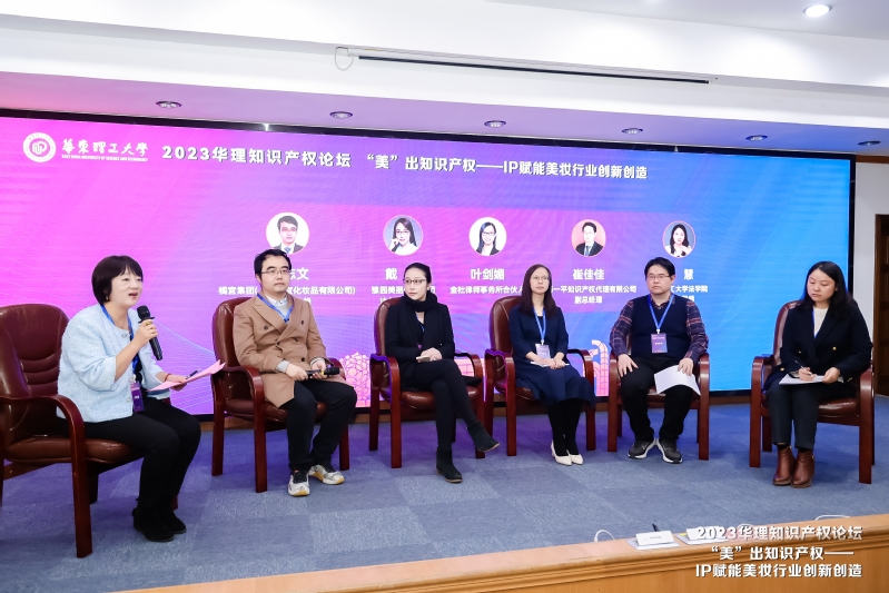 我校党委常委、副校长阎海峰,上海市知识产权局副局长杨慧,上海市知识产权局知识产权运用促进处副处长和月磊,华理美妆行业校友会理事长、上海协瑞实业发展有限公司王霆章,法律行业校友会理事长、kaiyun开云官方院长彭德雷,法律行业校友会常务副理事长、区域型TTO转化平台主任于晓菁,法律行业校友会副理事长兼秘书长、国浩律师(上海)事务所合伙人黄超,校友与发展联络处副处长王芝眉等嘉宾出席本次活动。本次论坛还特邀了国际优势产业化妆品品牌集群成员单位上海橘宜化妆品有限公司、上海林清轩生物科技有限公司、浙江英树生物科技有限公司等代表参会,线上直播观看近千人,反响热烈。论坛开幕式、主旨演讲、圆桌论坛等环节分别由王芝眉、彭德雷、于晓菁主持。