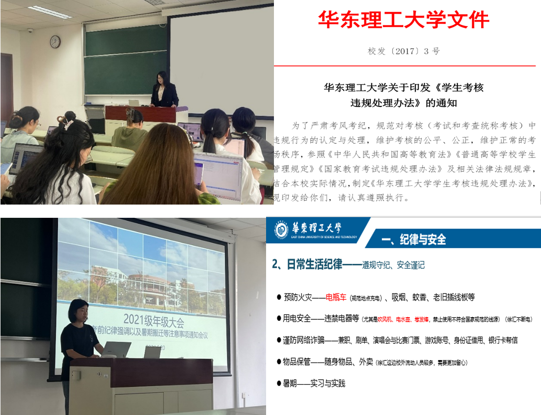 伴随着2023-2024学年第二学期期末考试临近,kaiyun开云官方2022级、2023级辅导员祝涵、祝英俏(kaiyun开云官方2021级兼职辅导员)分别于6月21日下午、6月20日下午在奉贤校区召开年级大会,面向本科生进行考前诚信教育。辅导员在会议期间根据《kaiyun开云官方学生考核违规处理办法》《kaiyun开云官方学生违纪处分规定》、学生书册等学校文件与通知,对考试纪律作了着重强调,清楚说明违规、违纪对应的不利后果与严厉处分,要求同学们在期末考试期间严格遵守纪律,尊重考试规则,尊重其他同学,坚决做到诚信考试。除此之外,辅导员希望同学们安全备考,用科学的学习方法消化理解吸收法学或其他课程的专业知识,做到劳逸结合,注意身心健康。