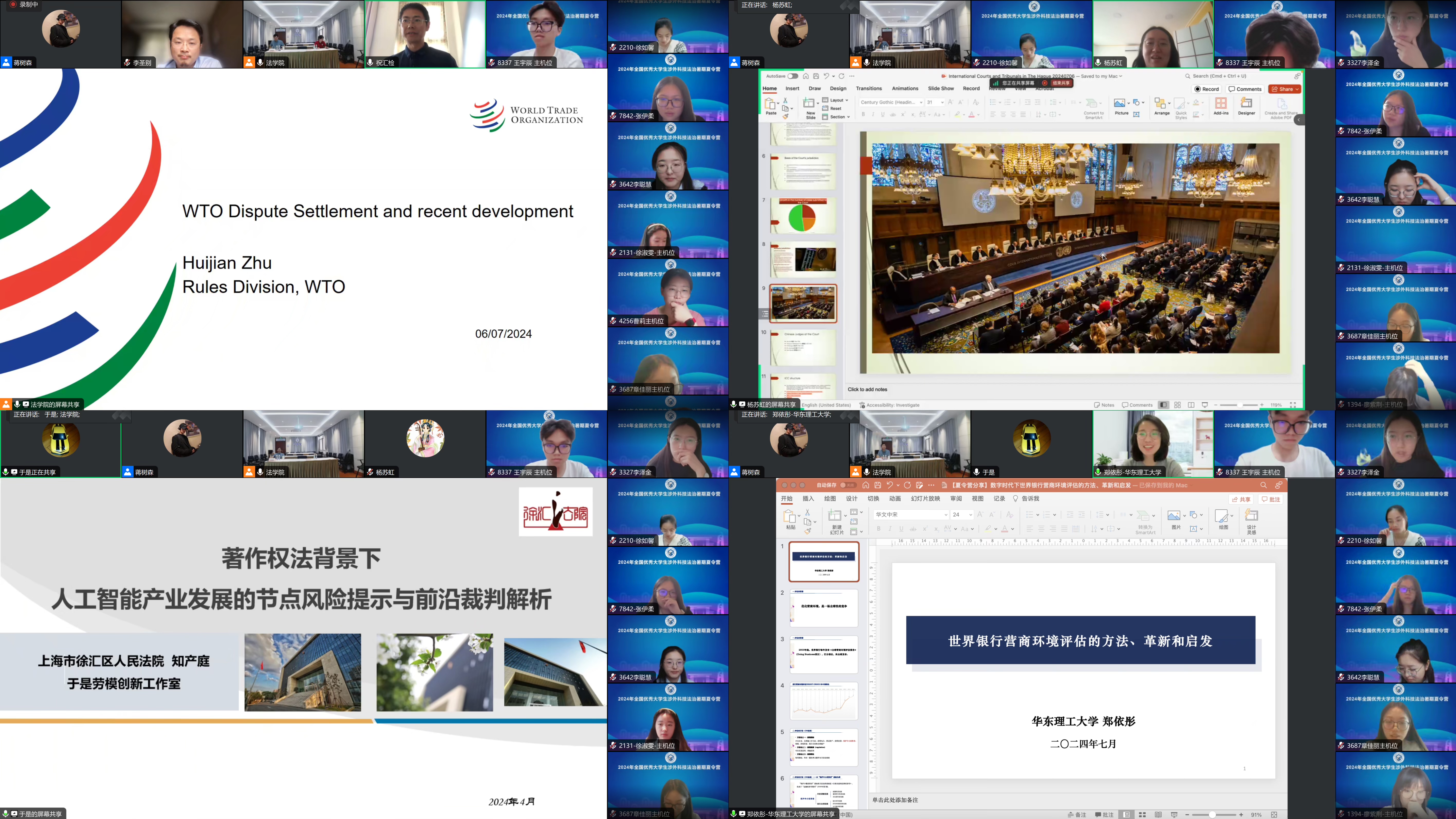 2023级研究生代表黄润鑫、徐静与营员们分享了在校的学习和生活情况。中国商飞法律实务处副处长李圣别就“专业化解纷护航先导产业发展”,世界贸易组织祝汇检就“世界贸易组织争端解决最新发展”,联合国国际法院法官助理杨苏虹就“海牙国际法庭与青年法律人才培养”,上海市徐汇区人民法院知识产权庭副庭长、全国法院知识产权审判工作先进个人于是就“著作权法背景下人工智能产业发展的节点风险提示与前沿裁判解析”,kaiyun开云官方副教授郑依彤就“世界银行营商环境评估的方法、革新和启发”等主题进行了交流。营员们被精彩的内容吸引,积极与专家学者们互动交流。