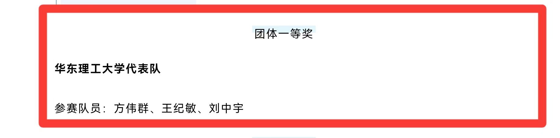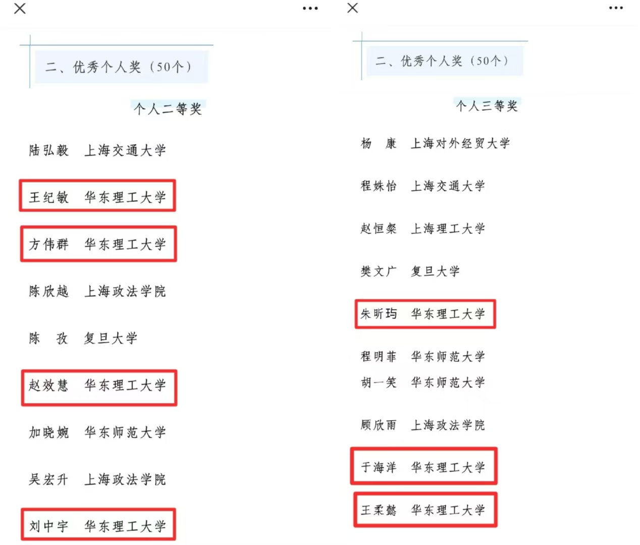 初赛阶段,华理代表队成员方伟群、王纪敏、赵效慧、刘中宇、朱昕玙、于海洋、王柔懿7位同学脱颖而出,荣获“优秀个人奖”。他们以扎实的知识、敏捷的思维和出色的团队合作,为华理赢得了荣誉。